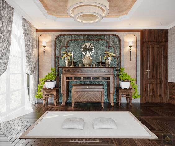 Cách bố trí này giúp giữ bố cục cân đối và tôn lên sự linh thiêng của khu vực thờ cúng.