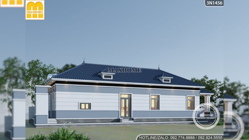 Bên hông công trình có bố trí các cửa sổ và cửa phụ bằng kính khung nhôm giúp mang lại sự thông thoáng và tận dụng tối đa ánh sáng tự nhiên. Ngoài ra, trên mái còn được thiết kế thêm các ô cửa nhỏ (chuồng chim) giúp lưu thông không khí và hạn chế sự bí bách cho ngôi nhà. Tất cả chi tiết này kết hợp lại đã được Maxhome tạo nên một mặt bên đơn giản nhưng rất tinh tế, toát lên phong cách hiện đại của mẫu nhà cấp 4.