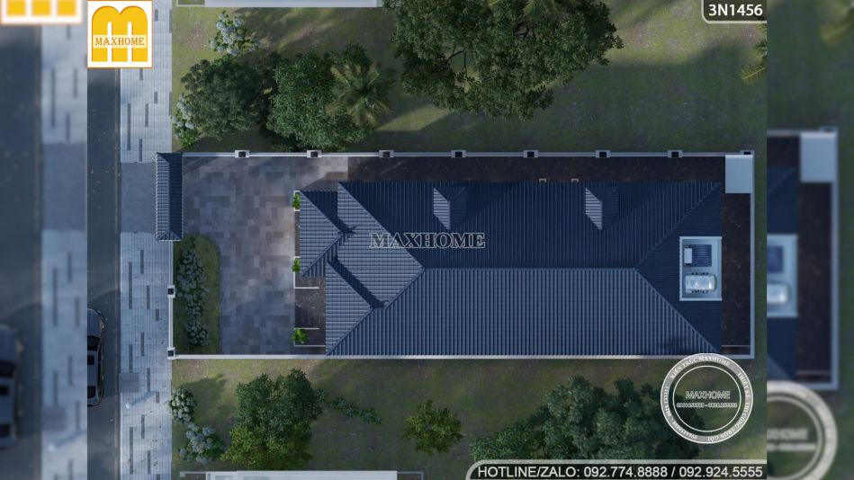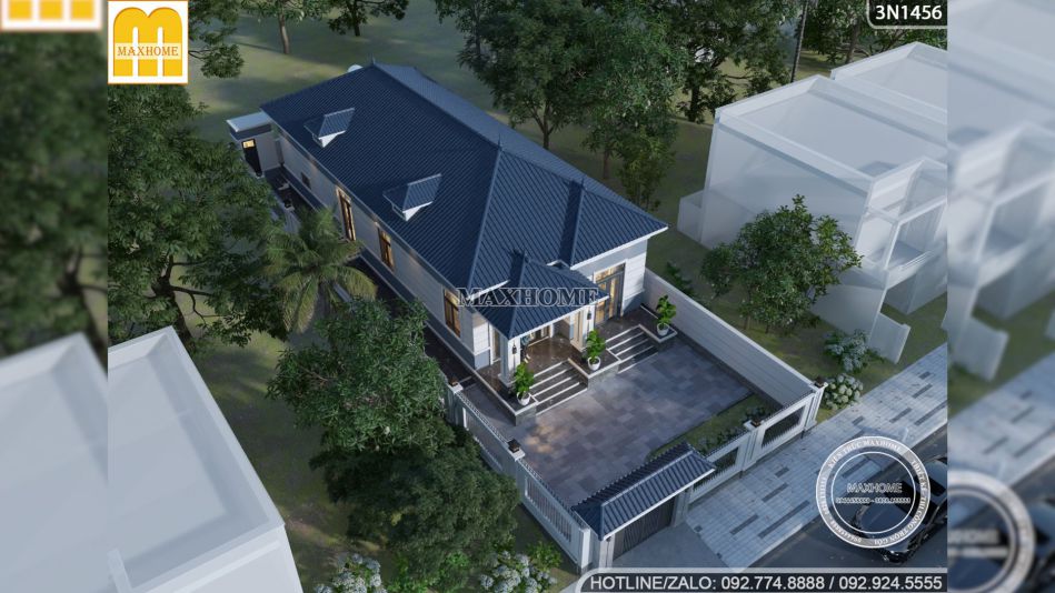 Đặc biệt, công trình được sử dụng hệ mái Nhật màu xanh than đậm mang đến sự vững chãi vừa tạo cảm giác thanh thoát. Mái Nhật có độ dốc vừa phải để đảm bảo tính thẩm mỹ mà vẫn giúp thoát nước nhanh, hạn chế rong rêu, đảm bảo độ bền đẹp theo thời gian. Sự kết hợp của ngói Maxhome cao cấp cùng gam màu sơn trắng xanh nhẹ nhàng đã tạo nên tổng thể hài hòa, bắt mắt ngay từ cái nhìn đầu tiên.