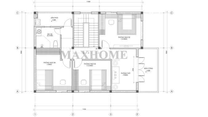 Ba phòng ngủ được sắp xếp hợp lý xung quanh mặt bằng tầng, tạo sự riêng tư và thuận tiện trong sinh hoạt. Ngoài ra, tầng 2 còn bố trí một nhà vệ sinh chung đặt đồng trục với tầng 1, giúp tối ưu kỹ thuật và thuận tiện cho quá trình sử dụng lâu dài. Tiếp bên cạnh nhà vệ sinh là sân phơi được thiết kế hợp lý, kín đáo nhưng thông thoáng, đáp ứng tốt nhu cầu sinh hoạt mà không ảnh hưởng đến vẻ đẹp chung của ngôi nhà.