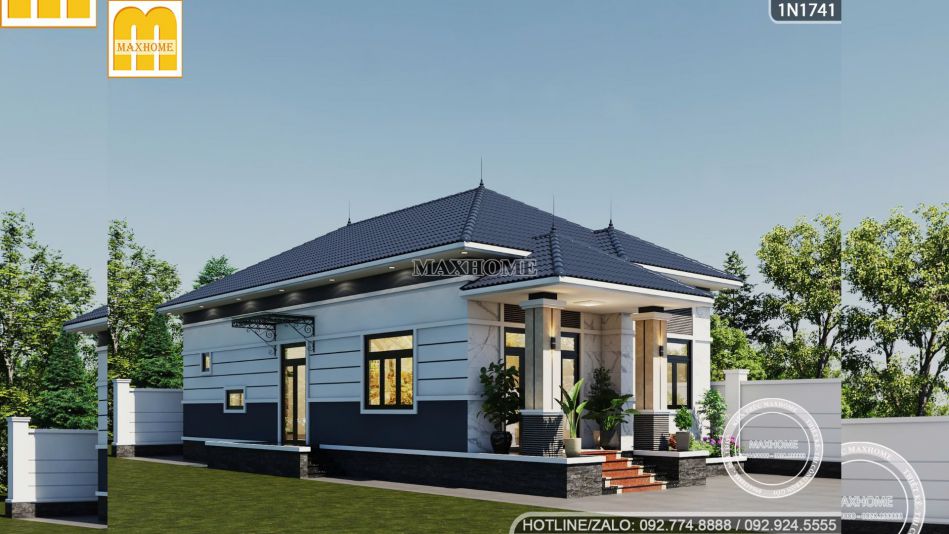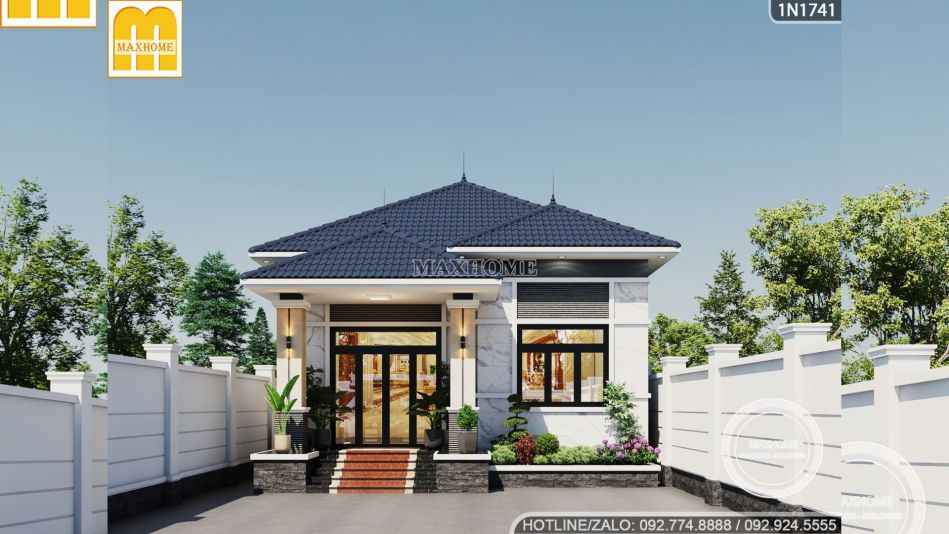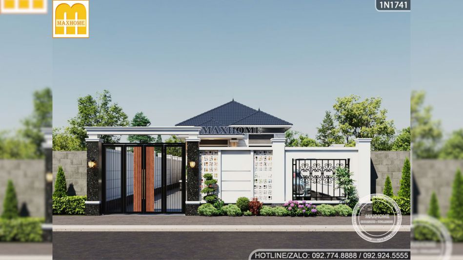 Mẫu nhà đẹp hiện lên bề thế ngay từ mặt tiền có chiều ngang rộng 9,3m, trong đó đội ngũ thiết kế Maxhome đã khéo léo tạo ra một khoảng trống 4,3m để thiết kế khu vực sảnh chính khang trang. Đây là không gian mở rộng mở như một lời chào đón nồng hậu của gia chủ gửi tới khách quý, phía trên là hệ mái che kiểu dáng mái Nhật được lợp đồng điệu tạo nên một chỉnh thể thống nhất và cực kỳ hút mắt.