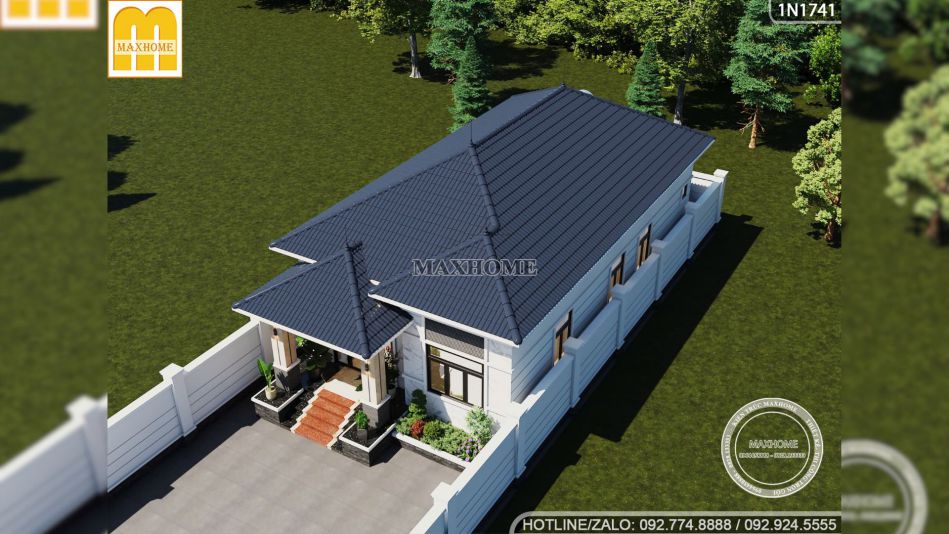 Nhắc đến mái Nhật trong bản vẽ này, không thể không ngợi khen hệ mái được ứng dụng theo lối xếp tầng lớp lớp đã giúp tạo nên diện mạo bề thế và uy nghi cho ngôi nhà cấp 4 mái Nhật 3 phòng ngủ của gia đình anh Hiển, công trình nhờ đó mà nổi bật hơn giữa không gian xanh mát xung quanh.