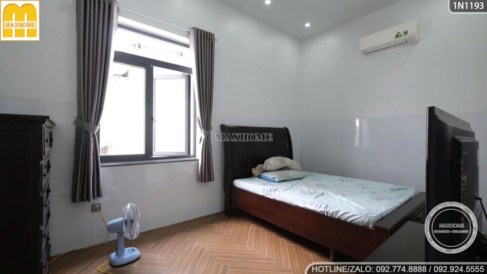 Không gian phòng ngủ mang lại cảm giác riêng tư và thư giãn, sàn phòng được lát gạch giả gỗ tone nâu ấm, hòa hợp với nội thất gỗ của giường và tủ quần áo. Mỗi căn phòng đều có cửa sổ lớn mở ra góc nhìn xanh mát ra vườn giúp đón nắng và gió tự nhiên. Đây chính là nét đặc trưng của kiểu nhà vườn đẹp, nơi mỗi khoảng không gian đều kết nối hài hòa với thiên nhiên.