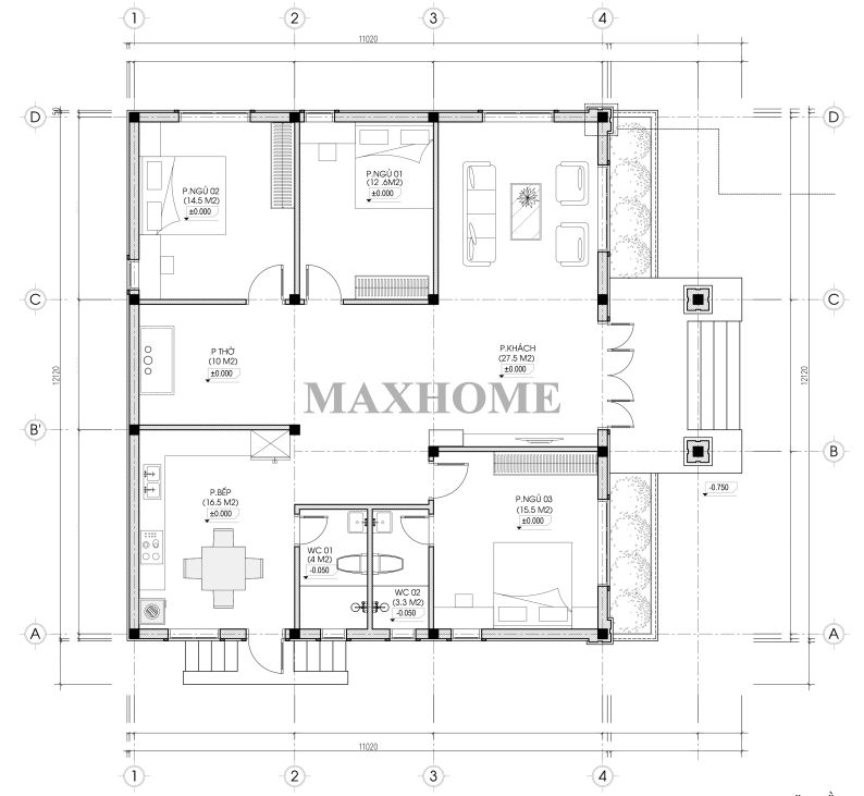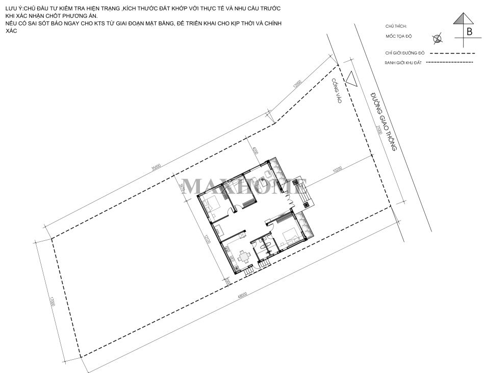 Dựa vào hoa tiêu chữ B trên mặt bằng định vị, ngôi nhà được đặt theo hướng Đông Bắc, hợp phong thủy với mệnh của gia chủ. Công trình có kích thước 12,1 x 11 m, tổng diện tích sử dụng khoảng 135m². Bố cục được tối ưu để không gian tiện nghi, thoải mái và vận hành hiệu quả cho cả gia đình.