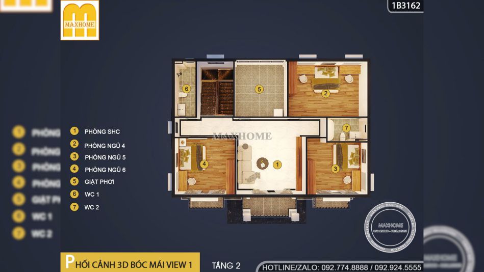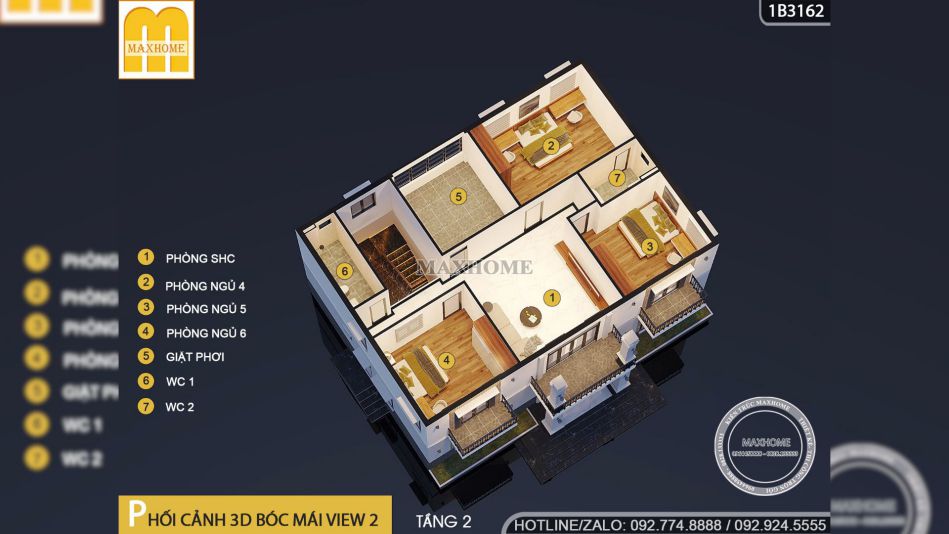 Tầng 2 tiếp nối không gian sống tiện nghi với cách bố trí linh hoạt, ở giữa là phòng sinh hoạt chung 23,5m2 để các thành viên có thể quây quần trò chuyện, thư giãn sau một ngày làm việc. Kế bên là khu sân phơi rộng 13,5m2 thuận tiện cho việc giặt giũ, phơi đồ và đón gió tự nhiên. 3 phòng ngủ và 2 nhà vệ sinh trên tầng 2 đều được sắp xếp tương tự như tầng dưới. Nhờ thiết kế tối ưu này mà bản vẽ nhà 2 tầng 6 phòng ngủ của Maxhome không chỉ đáp ứng công năng hoàn hảo mà còn đảm bảo sự thoải mái, riêng tư và kết nối hài hòa giữa các thành viên trong gia đình chú Lục.