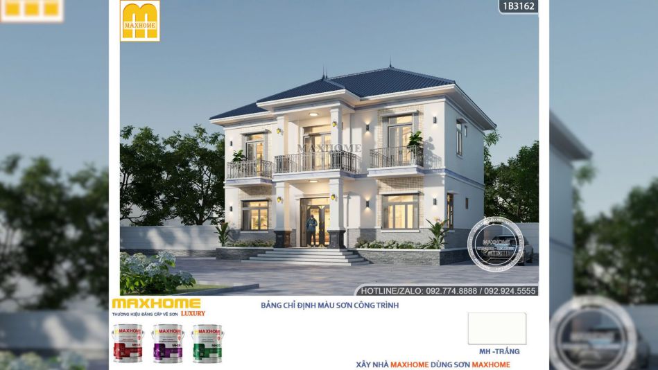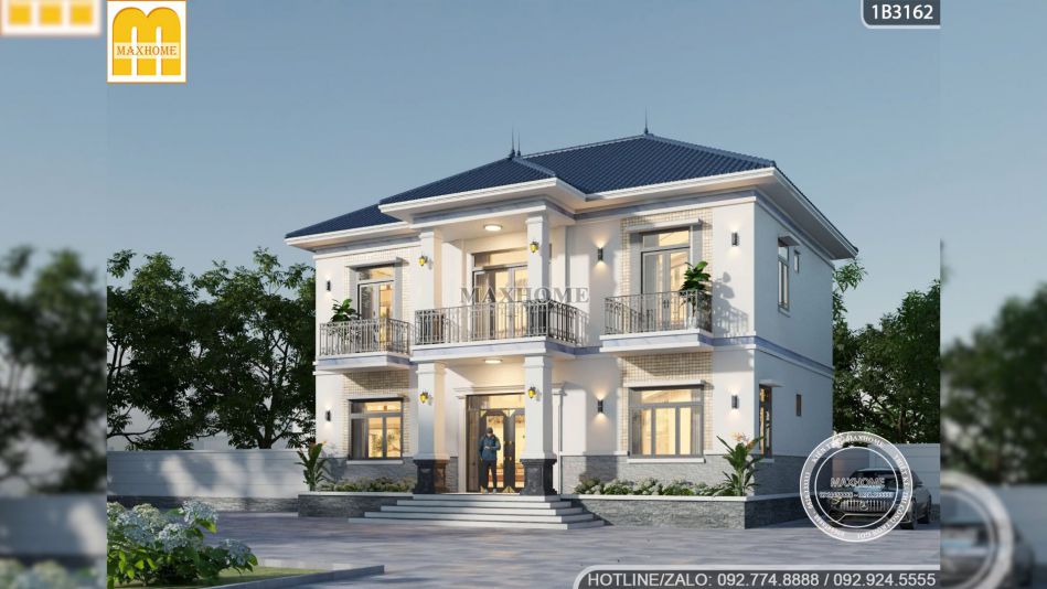 Toàn bộ công trình được phủ sơn trắng trang nhã, sáng sủa và dễ phối hợp với các vật liệu trang trí khác. Để tránh đơn điệu, kiến trúc sư Maxhome đã tinh tế kết hợp ốp gạch trang trí ngoại thất và mang lại sự sinh động cho bề mặt tường. Đặc biệt, những viên gạch vàng được ốp bao quanh mỗi ô cửa sổ tạo nên đường viền ấm áp vừa nổi bật vừa tạo chiều sâu thị giác. Đây là chi tiết nhỏ nhưng góp phần lớn trong việc định hình phong cách tổng thể của bản vẽ nhà 2 tầng 6 phòng ngủ này.