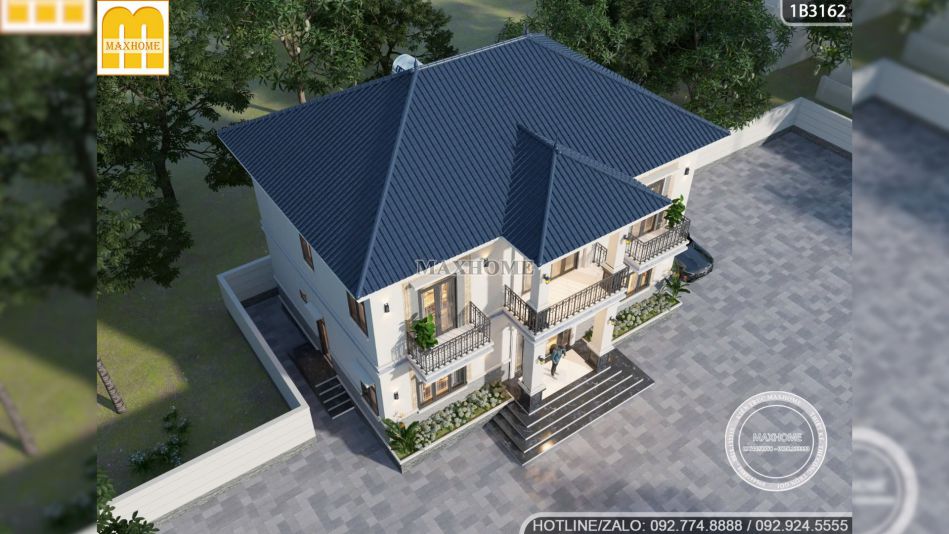 Một trong những điểm nổi bật không thể bỏ qua là hệ mái Nhật màu xanh được thiết kế cân đối với thân nhà. Mái Nhật vốn nổi tiếng với khả năng chống nóng, thoát nước nhanh và mang đến vẻ thanh thoát cho tổng thể kiến trúc. Ở công trình này, màu xanh của mái nổi bật trên nền trắng của tường giúp tạo điểm nhấn thẩm mỹ và đồng thời khiến ngôi nhà thêm phần sang trọng. Khi kết hợp với hình khối vững chãi của bản vẽ nhà 2 tầng này, hệ mái Nhật không chỉ làm tăng tính bề thế mà còn giúp ngôi nhà toát lên phong thái hiện đại, bền vững theo thời gian.