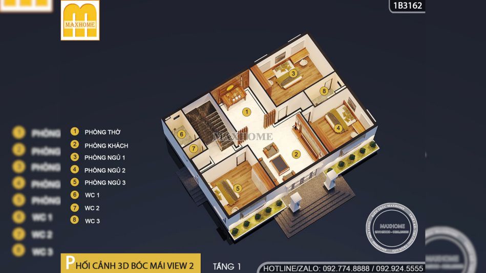 Dưới đây là mẫu thiết kế hướng đến sự tiện nghi và bền vững, một bản vẽ nhà 2 tầng 6 phòng ngủ của gia đình chú Lục ở Thái Nguyên do Maxhome thực hiện khiến ai nhìn cũng yêu thích. Ngôi nhà mang vẻ đẹp hài hòa giữa hiện đại và truyền thống mà cũng vừa khang trang vừa gần gũi, phù hợp với nếp sống của một đại gia đình nhiều thế hệ.