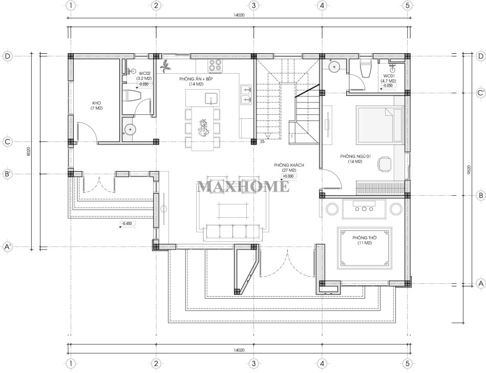 Từ cửa chính bước vào là khu vực phòng khách rộng rãi với diện tích 27m², được thiết kế thông thoáng, thuận tiện cho sinh hoạt chung và đón tiếp khách. Trên tầng 1, phòng thờ được bố trí riêng biệt, trang nghiêm và yên tĩnh. Tiếp nối phòng khách là không gian bếp – ăn hiện đại, tiện nghi. Phòng ngủ 01 được thiết kế với nhà vệ sinh khép kín bên trong, đảm bảo sự riêng tư. Ngoài ra, tầng 1 còn bao gồm một phòng kho và một nhà vệ sinh chung, tối ưu hóa công năng và mang lại sự thuận tiện cho cả gia đình.