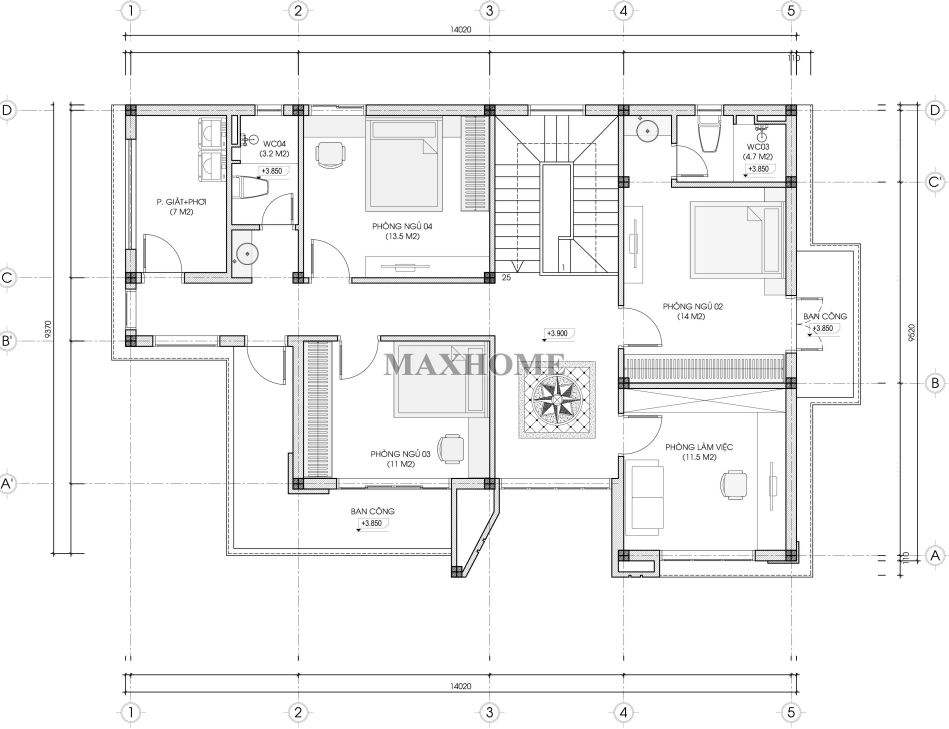 • Tầng 2: Phòng làm việc, 3 phòng ngủ, 2 wc, phòng giặt phơi