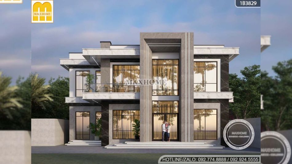 Mẫu biệt thự 2 tầng hiện đại gây ấn tượng với sự kết hợp tinh tế giữa tông màu ghi của sơn giả đá và sắc trắng sang trọng từ gạch granite ốp quanh nhà. Mặt tiền được thiết kế với hình khối vuông vức, mạnh mẽ, tạo cảm giác vững chãi nhưng vẫn thanh thoát. Điểm nhấn của công trình là các chi tiết ốp đá trang trí, lan can kính cường lực trong suốt và những đường nét phào chỉ nhẹ nhàng, giúp tổng thể trở nên hiện đại, sang trọng và hài hòa với không gian đô thị. Hệ thống ánh sáng mặt tiền được bố trí khoa học, nhấn mạnh các góc kiến trúc và tạo hiệu ứng nổi bật vào ban đêm, đồng thời mang lại cảm giác ấm cúng và tiện nghi cho gia đình.