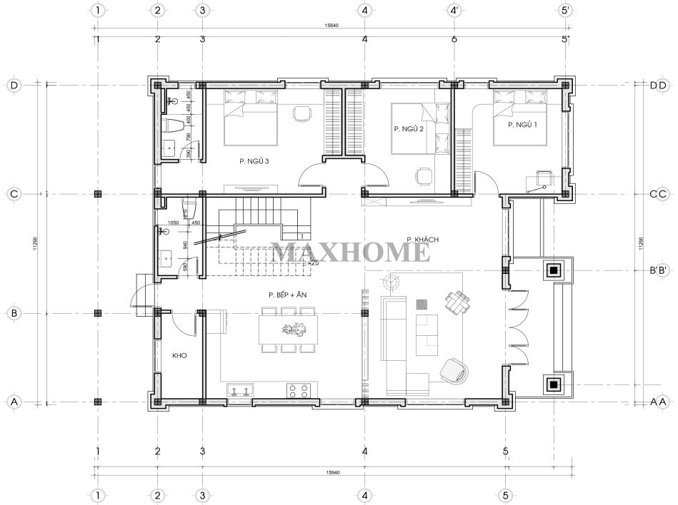 • Tầng 1: Phòng khách, phòng bếp, 3 phòng ngủ, 2 wc, kho