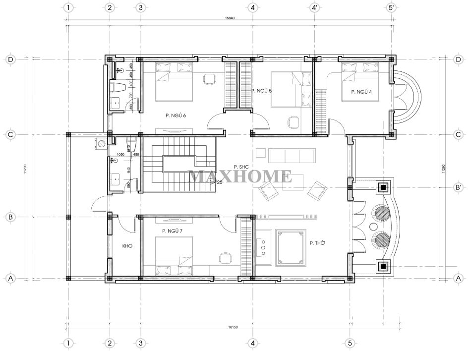 Tầng 2 được quy hoạch hợp lý, vừa đảm bảo sự tiện nghi vừa giữ được không gian riêng tư cho từng thành viên. Phòng thờ đặt ở vị trí trang trọng, hướng ra ban công rộng thoáng, mang đến sự tôn nghiêm và chuẩn mực phong thủy. Ngay phía sau là phòng ngủ số 7 cùng một kho nhỏ gọn gàng, đáp ứng nhu cầu lưu trữ.