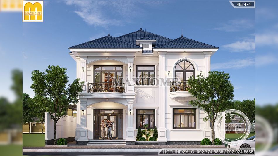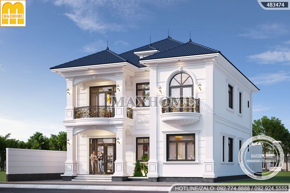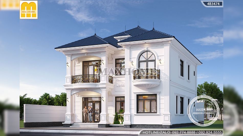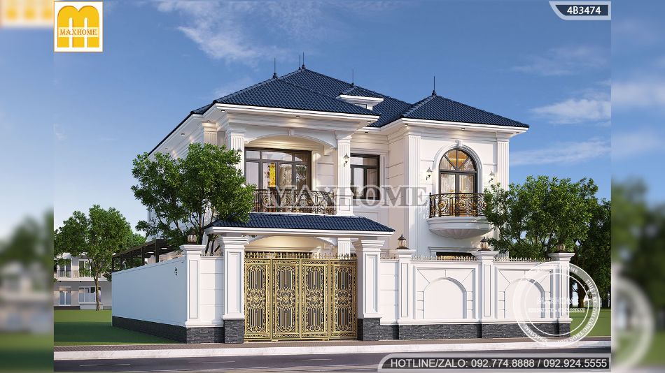 Biệt thự 2 tầng mái Nhật mang phong cách tân cổ điển sang trọng, tinh tế và đầy cuốn hút. Tổng thể kiến trúc được tổ chức cân đối, những khối vuông vức vững chãi kết hợp cùng các đường cong mềm mại ở hệ cửa vòm và ban công uốn lượn, tạo nên vẻ đẹp quyến rũ, khác biệt. Hệ mái Nhật xanh than thanh thoát, có độ dốc vừa phải, không chỉ gia tăng tính thẩm mỹ mà còn mang lại công năng che chắn, chống nóng và thoát nước hiệu quả.