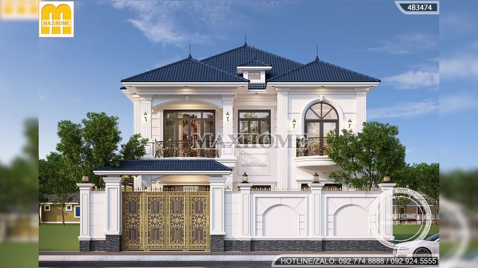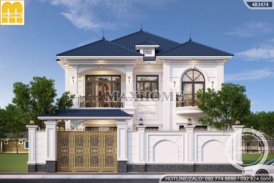 Mặt tiền 12m hoành tráng ghi dấu ấn mạnh mẽ với các trụ cột lớn, phào chỉ đắp nổi sắc sảo, cùng lan can hoa văn sắt nghệ thuật mang hơi thở cổ điển tinh tế. Những ô cửa kính khung nhôm xingfa cao cấp vừa giúp không gian nội thất luôn ngập tràn ánh sáng tự nhiên, vừa tăng sự kết nối với cảnh quan bên ngoài.