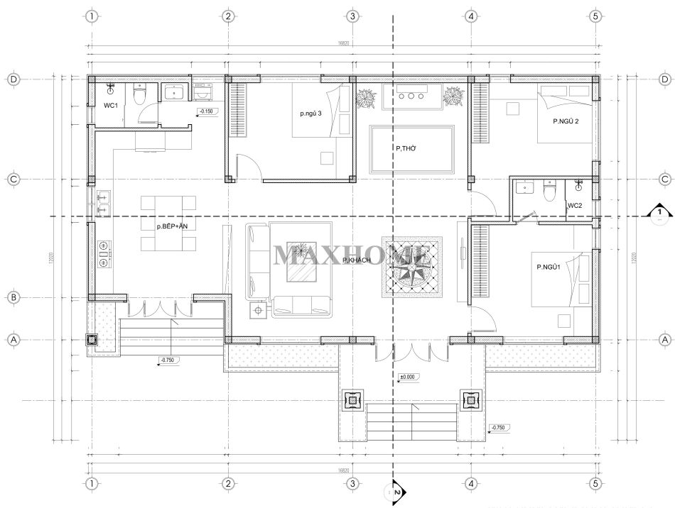 Khu vực bếp và phòng ăn được bố trí khoa học, có lối đi dẫn ra sảnh phụ, giúp lưu thông không khí tốt hơn và tạo sự thuận tiện khi di chuyển. Ba phòng ngủ được sắp xếp quanh nhà, mỗi phòng đều có cửa sổ thoáng mát, mang đến không gian nghỉ ngơi thoải mái cho các thành viên. Ngoài ra còn 1 WC chung bố trí hợp lý đảm bảo nhu cầu sinh hoạt hàng ngày.