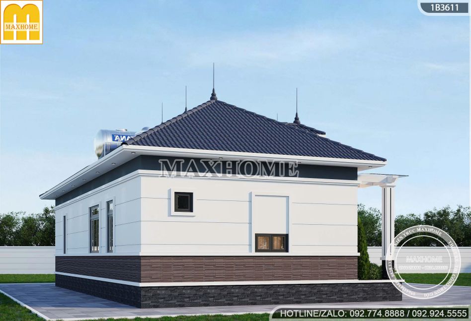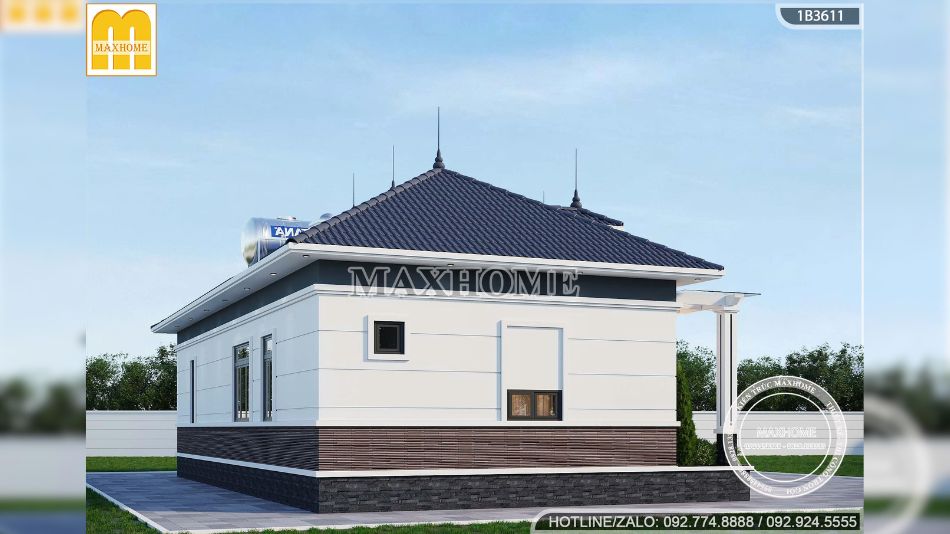 Bên cạnh đó, phần chân nhà được ốp gạch thẻ trang trí, không chỉ tăng tính thẩm mỹ mà còn giúp bảo vệ bề mặt tường trước tác động của thời tiết, mang lại vẻ đẹp bền vững theo thời gian.