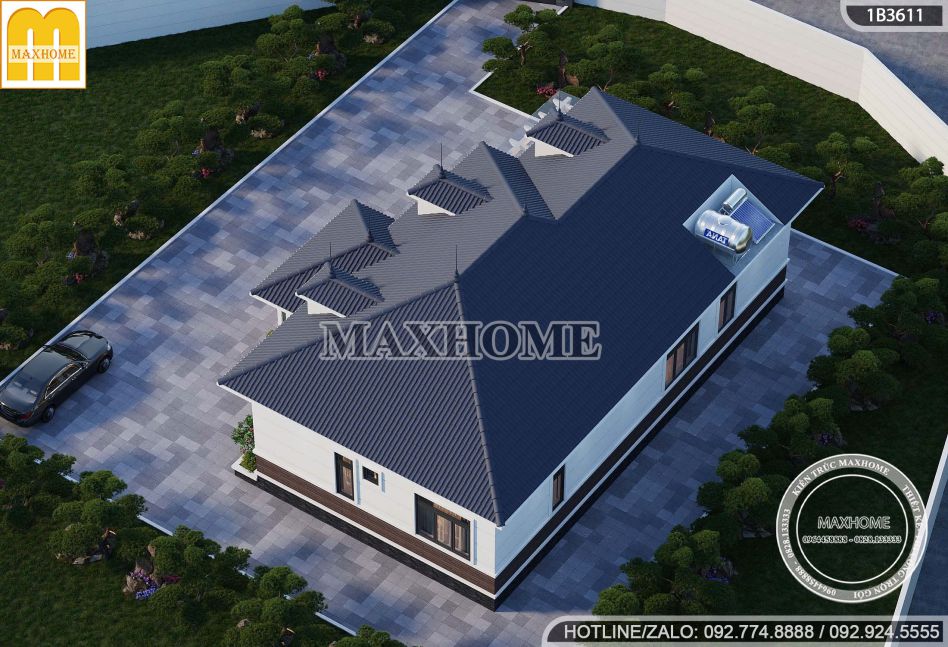 Hệ mái Nhật với gam màu xanh than sang trọng đã tạo nên điểm nhấn nổi bật cho tổng thể công trình. Các khối mái xếp chồng đăng đối, độ dốc vừa phải không chỉ mang lại vẻ bề thế, cân đối mà còn giúp thoát nước nhanh, hạn chế thấm dột, đảm bảo độ bền theo thời gian.