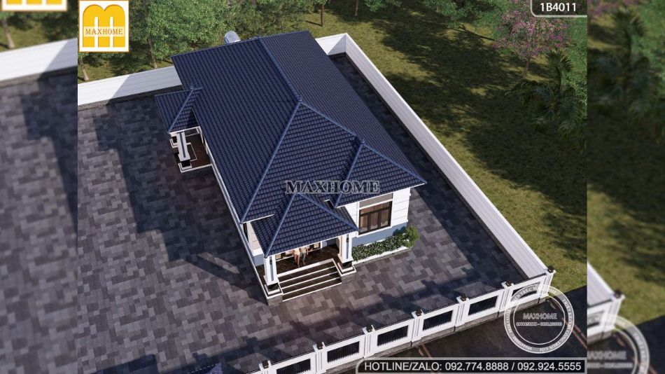 Từ góc nhìn trên cao, hệ mái Nhật của ngôi nhà hiện lên nổi bật với lớp ngói màu xanh than tinh tế. Gam màu này không chỉ tạo điểm nhấn sang trọng cho tổng thể công trình mà còn giúp phần mái hài hòa với cảnh quan xung quanh. Kiểu dáng mái Nhật với độ dốc vừa phải hỗ trợ thoát nước nhanh, chống ẩm mốc và nâng cao tuổi thọ công trình. Nhờ tính thẩm mỹ và công năng vượt trội, kiểu mái này đang được nhiều gia chủ ưa chuộng cho các mẫu nhà cấp 4 hiện đại.