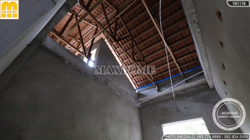 Nhìn từ bên trong, hệ mái Nhật được thi công kiên cố với độ dốc vừa phải, giúp công trình thông thoáng và thoát nước hiệu quả. Toàn bộ khung vì kèo bằng thép hộp chắc chắn được bố trí khoa học, liên kết chặt chẽ với các xà gồ và bản mái, tạo nên bộ khung vững chãi cho toàn bộ phần mái ngói.