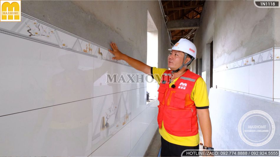 Đội ngũ kỹ thuật đang tiến hành kiểm tra kỹ lưỡng phần ốp lát gạch men trên tường, đảm bảo từng mạch ghép được thẳng hàng và chắc chắn. Mỗi viên gạch đều được căn chỉnh tỉ mỉ, vừa khít, giữ cho bề mặt phẳng đẹp và đúng thiết kế. Các bước thi công đều tuân thủ quy chuẩn chặt chẽ, giúp công trình nhà vườn mái Nhật đạt tính thẩm mỹ cao và độ bền vững lâu dài.