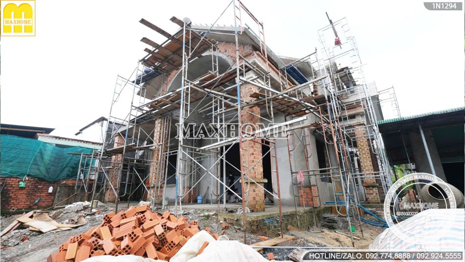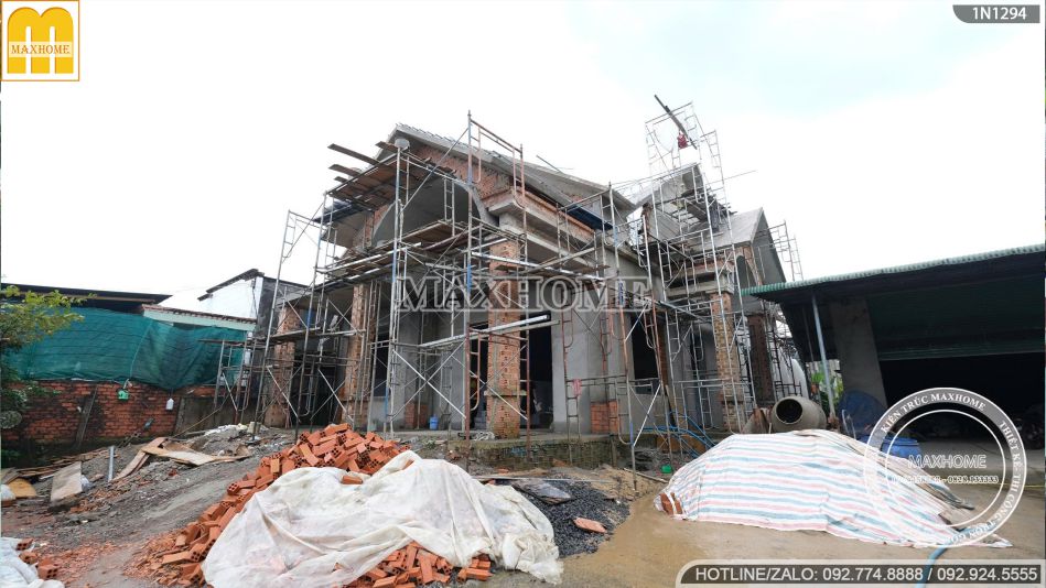 Ngôi nhà vườn mái Thái mang phong cách tân cổ điển hiện lên với những đường cong mái vòm mềm mại, toát lên vẻ sang trọng và tinh tế. Hệ cột trụ được thi công vững chãi, thể hiện sự tỉ mỉ và chuẩn xác trong từng chi tiết cấu trúc. Một phần tường đã được tô trát cẩn thận, kiểm tra bề mặt xi măng phẳng mịn, không rộp hay rỗ, hứa hẹn một diện mạo hoàn thiện đầy cuốn hút cho công trình.