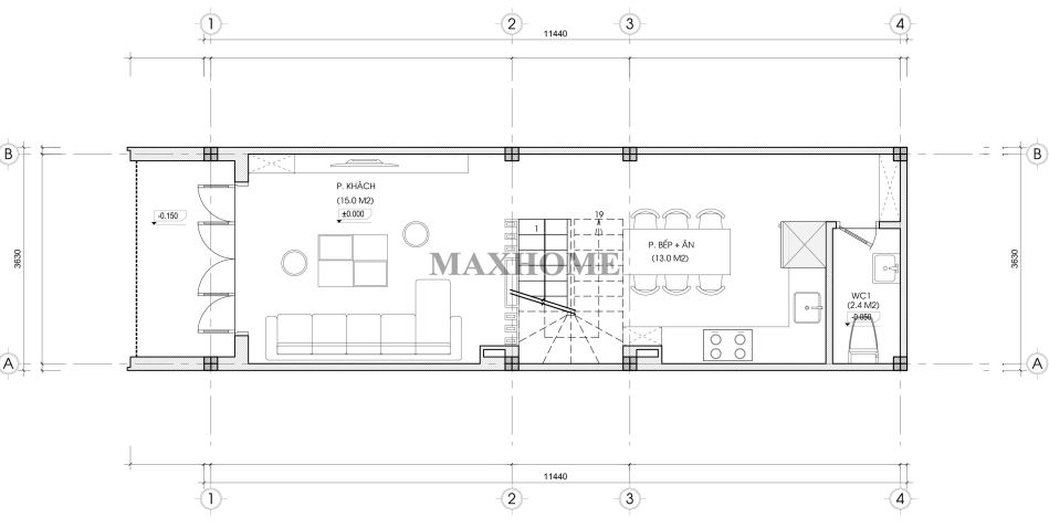 Từ cửa chính bước vào là không gian phòng khách rộng khoảng 15m², được thiết kế thoáng đãng và sang trọng, là nơi gia chủ tiếp đón khách và quây quần cùng gia đình. Tiếp nối khu vực này, cầu thang được bố trí ở vị trí trung tâm, vừa giúp phân tách các không gian chức năng vừa tạo sự thuận tiện trong di chuyển giữa các tầng. Phòng bếp kết hợp phòng ăn nằm phía sau với diện tích khoảng 13m², được thiết kế gọn gàng, tiện nghi, đảm bảo công năng sử dụng tối ưu. Cuối nhà là nhà vệ sinh chung, bố trí hợp lý để phục vụ sinh hoạt cho toàn bộ tầng, đồng thời vẫn đảm bảo sự riêng tư và thông thoáng.