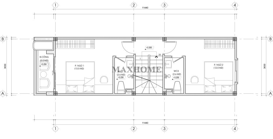 Tầng 3 được bố trí công năng tương tự như tầng 2, gồm 2 phòng ngủ khép kín, mỗi phòng đều tích hợp nhà vệ sinh riêng để đảm bảo sự thoải mái và thuận tiện trong sinh hoạt. Cách sắp xếp không gian khoa học giúp các thành viên có không gian nghỉ ngơi riêng tư, đồng thời vẫn đảm bảo sự thông thoáng và ánh sáng tự nhiên nhờ hệ thống cửa sổ bố trí hợp lý.