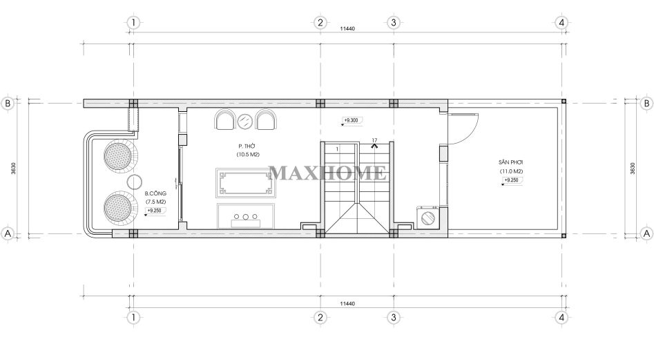 Tầng 4 được bố trí phòng thờ trang nghiêm – không gian linh thiêng nhất trong ngôi nhà, đặt ở vị trí cao nhất và hướng ra ban công phía trước, giúp đón nhận ánh sáng và sinh khí tự nhiên. Bàn thờ được sắp xếp đúng phong thủy, thể hiện sự tôn kính với tổ tiên. Phía sau là khu vực sân phơi, được thiết kế rộng rãi, thông thoáng, thuận tiện cho việc giặt giũ và phơi đồ, đồng thời có thể tận dụng làm không gian trồng cây xanh hoặc thư giãn ngoài trời.