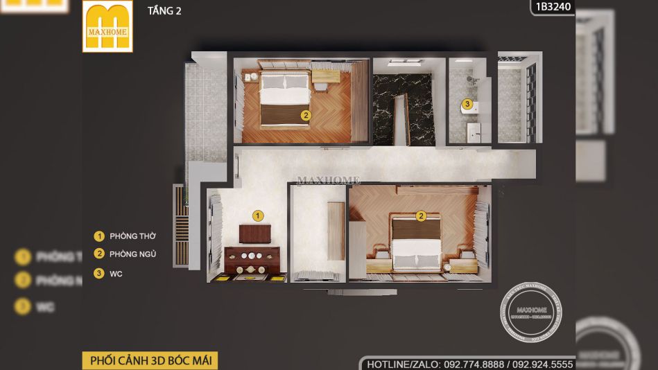 Tầng 2 bố trí phòng thờ 9m2 ở vị trí trang trọng nhất để thể hiện lòng hiếu kính của gia chủ với tổ tiên. Cạnh bên là 2 phòng ngủ thoáng mát có cửa sổ hướng ra ngoài giúp tận dụng tối đa ánh sáng tự nhiên và lưu thông không khí. Mỗi phòng đều có diện tích hợp lý và đáp ứng đầy đủ nhu cầu nghỉ ngơi của các thành viên trong gia đình. Ngoài ra, tầng này còn được bố trí thêm phòng kho nhỏ rất tiện để cất giữ đồ đạc ít dùng đến, cuối cùng là 1 nhà vệ sinh chung phục vụ cho cả tầng giúp đảm bảo sự tiện nghi.