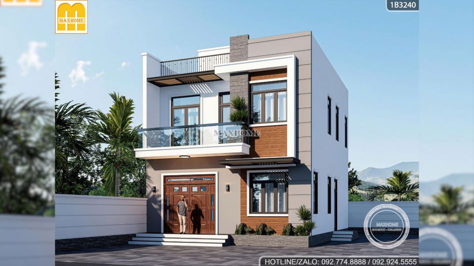 Maxhome đã khéo léo phối hợp giữa tông trắng tinh khôi và màu xám ghi trang nhã ở mặt tiền công trình. Bên cạnh đó, vị trí tường ốp gỗ nhựa ngoài trời để giúp mặt tiền thêm ấm áp, gần gũi và tự nhiên đồng thời hài hoà màu sắc với cửa chính bằng thép giả gỗ sang trọng. Sự tương phản giữa các vật liệu đã mang lại chiều sâu cho tổng thể khiến căn nhà 2 tầng 1 tum này trở nên khác biệt và có hồn hơn hẳn so với những công trình cùng phong cách.