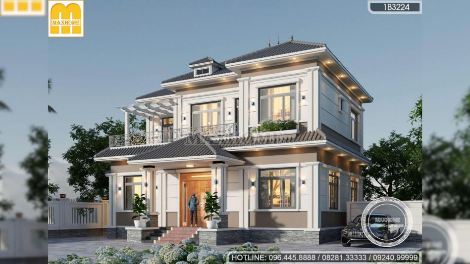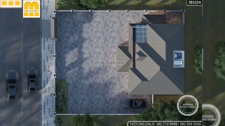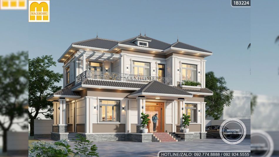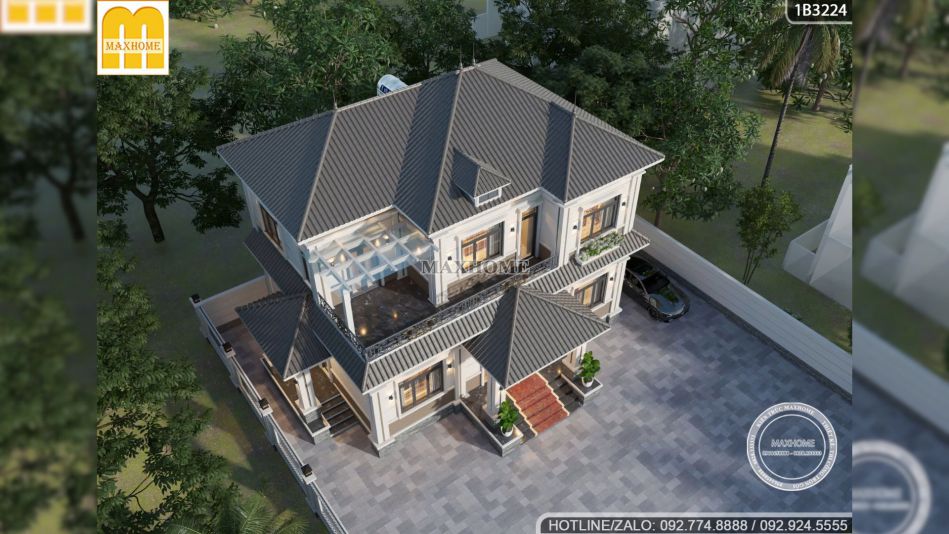 Mái Nhật là lựa chọn lý tưởng cho những công trình cần sự bền bỉ, thoáng mát và thẩm mỹ cao. Ưu điểm lớn nhất của kiểu mái này nằm ở độ dốc vừa phải giúp nước mưa thoát nhanh, hạn chế tối đa tình trạng thấm dột hay đọng nước. Kết cấu mái nhà anh Đức đã được Maxhome thiết kế chắc chắn, độ vươn rộng 710mm nên che nắng hiệu quả và tạo bóng mát cho toàn bộ không gian bên dưới. Về thẩm mỹ, dáng mái cân đối, hiện đại nhưng vẫn giữ nét thanh lịch và phù hợp với nhiều phong cách kiến trúc, đặc biệt là căn nhà vườn 2 tầng mái Nhật hiện đại này.