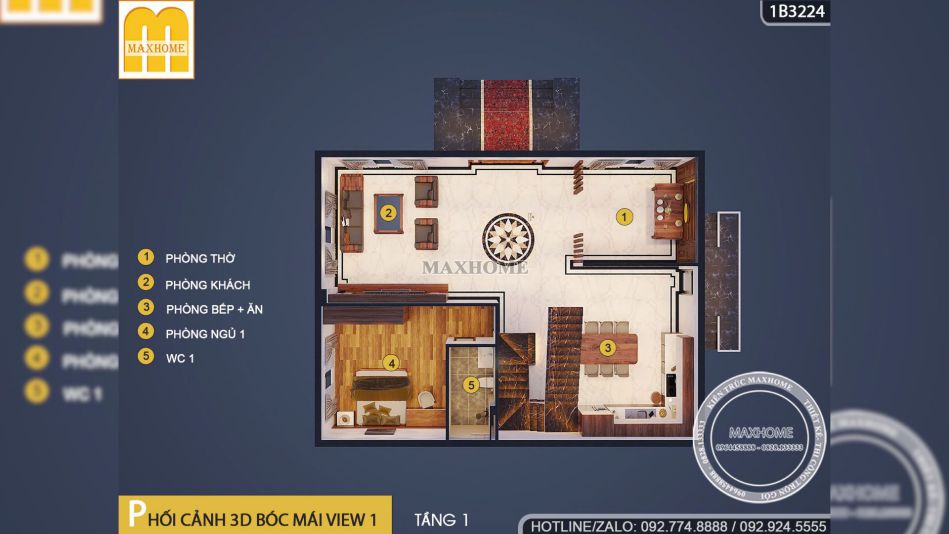 Tầng 1 được bố trí theo hướng tiện nghi và kết nối, phù hợp cho sinh hoạt hằng ngày của gia đình Đức. Ngay khi bước vào đại sảnh, bên cạnh là phòng khách rộng rãi, sang trọng với nội thất gỗ chủ đạo và vách giả đá tạo điểm nhấn. Đối diện là phòng thờ trang nghiêm được bố trí khéo léo để gia chủ dễ dàng thắp hương và giữ nếp sống tâm linh. Khu phòng bếp và bàn ăn được bố trí liền mạch tạo sự ấm cúng và thuận tiện khi cả nhà quây quần. Tầng này cũng có 1 phòng ngủ có nhà vệ sinh chung khép kín phục vụ sinh hoạt cá nhân thuận tiện.