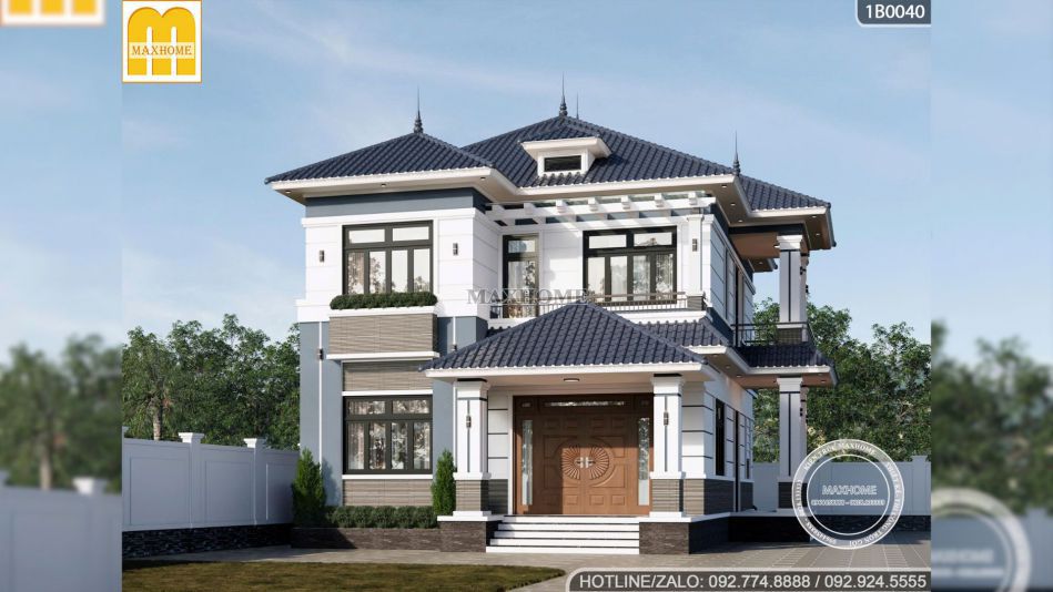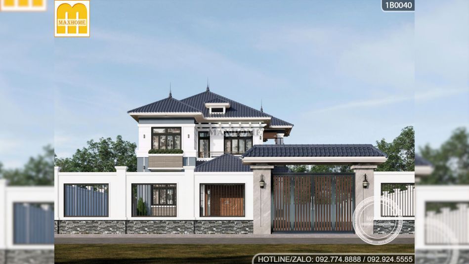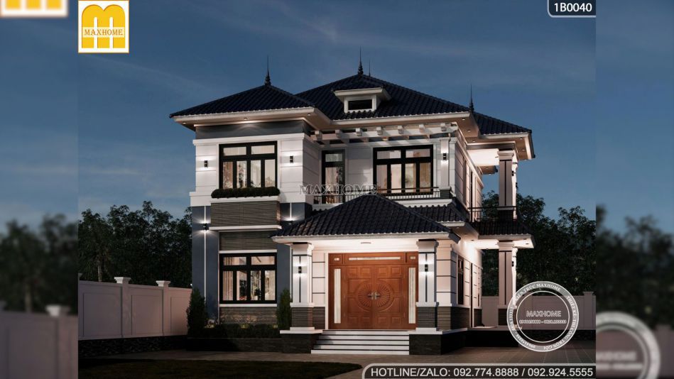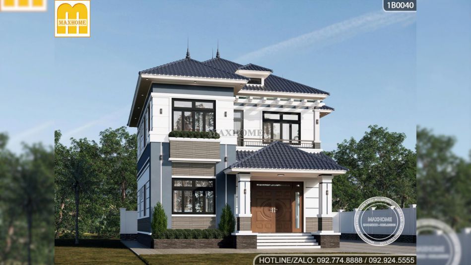 Mẫu nhà đẹp được thiết kế với chiều cao thông thuỷ tầng 1 là 3,9m, tầng 2 cao 3,6m và hệ mái Nhật cao 3m. Maxhome giảm dần chiều cao theo tầng để tối ưu tải trọng công trình và đồng thời nhờ có tỉ lệ này mà tạo ra cảm giác ngôi nhà vừa vặn, không quá cao nhưng vẫn đủ độ rộng và thoáng. Ngoài ra, hệ mái Nhật xếp lớp ngói xanh than là điểm khiến công trình khác biệt, nổi bật trên nền trắng và tạo sự cá tính, hiện đại. Trên mái còn có ô cửa kính lập là kích thước 800 x 400mm nhỏ xinh nhưng lại giúp mái nhà có thêm điểm nhấn thông thoáng.