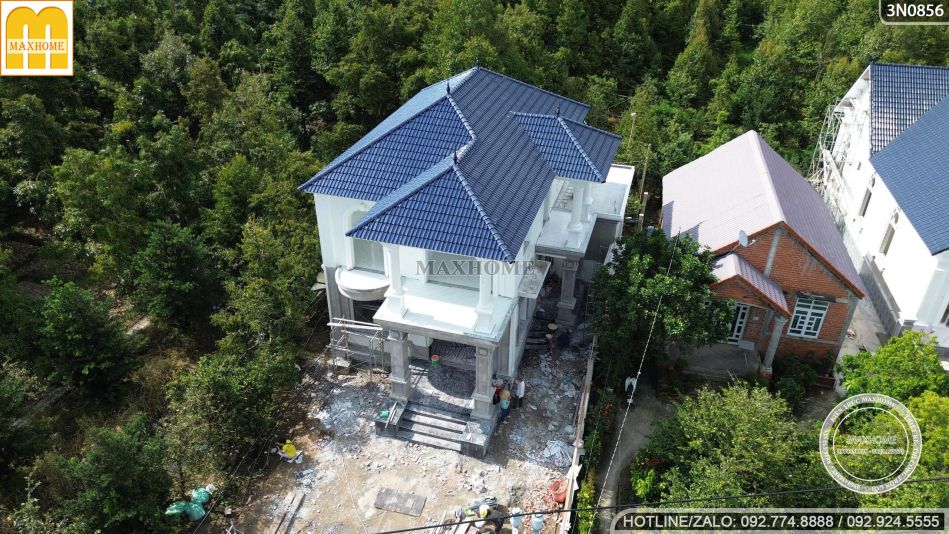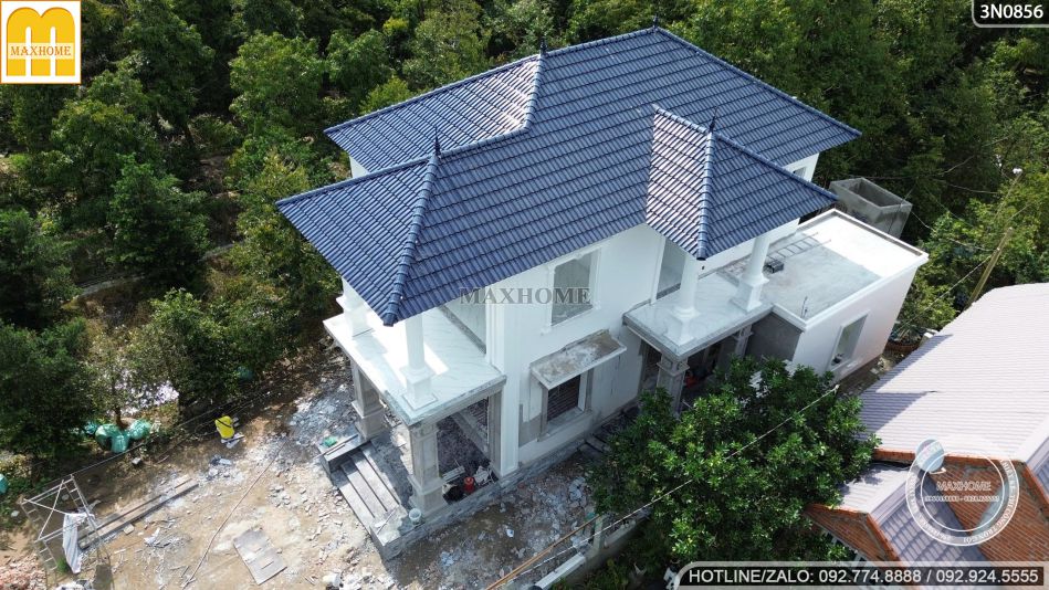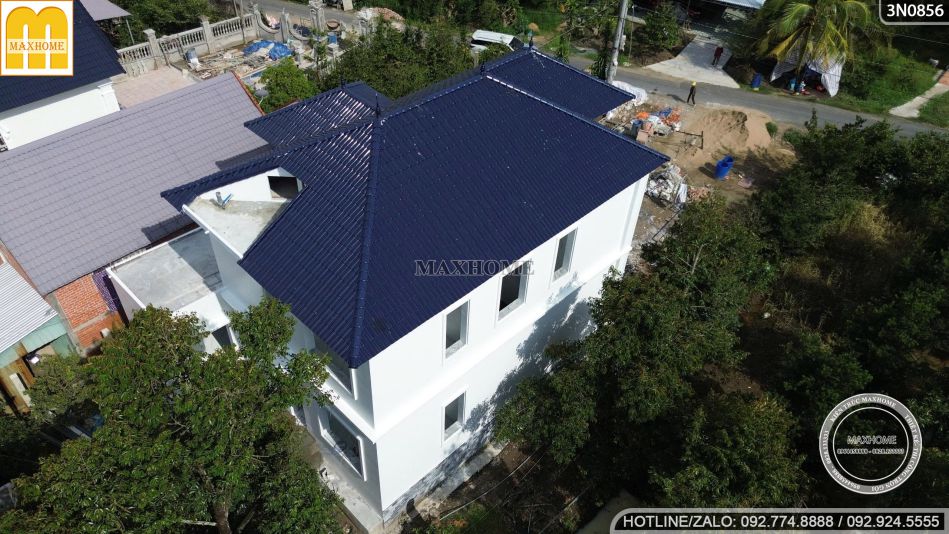 Đặc biệt ở thời tiết nắng nóng quanh năm ở Tiền Giang, hệ mái Nhật với lớp ngói dày dặn cũng phát huy khả năng chống nóng hiệu quả và giữ cho không gian bên trong luôn dễ chịu. Khi mái được lợp hoàn thiện, công trình 2 tầng mái Nhật tân cổ điển này không chỉ thêm phần bề thế, sang trọng mà còn trở thành một điểm nhấn kiến trúc khác biệt trong khu vực vừa đẹp mắt vừa đảm bảo tuổi thọ lâu dài theo thời gian.