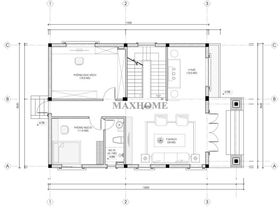Từ sảnh chính bước vào, không gian đầu tiên là phòng khách rộng rãi, được bố trí sang trọng và thoáng đãng. Bên trái phòng khách là phòng thờ diện tích 10,5m², thiết kế trang nghiêm, hợp phong thủy, tạo sự cân đối cho tổng thể. Tiếp nối là phòng đọc sách yên tĩnh, nơi các thành viên có thể thư giãn, đọc sách hoặc làm việc. Phòng ngủ master được bố trí ở phía sau, đảm bảo sự riêng tư và yên tĩnh cho gia chủ. Cuối nhà có lối đi ra cửa hậu kết nối với khu bếp ăn được xây tách riêng, giúp không gian sinh hoạt chính luôn sạch sẽ, thông thoáng và tránh ảnh hưởng bởi mùi nấu nướng.