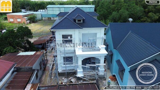 Từ hình ảnh tổng thể do đội ngũ truyền thông Maxhome ghi lại có thể thấy rõ công trình là một mẫu nhà 2 tầng hiện đại đang được thi công rất tốt. Phần sảnh phía trước được đổ bê tông hoàn chỉnh để tạo thành khối liên kết chặt chẽ với phần khung nhà, đảm bảo độ bền vững và hạn chế tối đa tình trạng nứt ở vị trí tiếp giáp giữa bậc và nhà.