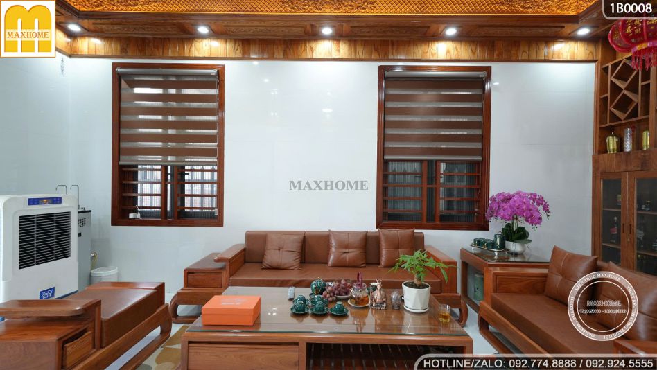 Bước vào trong, cảm giác đầu tiên là sự hài hòa giữa ánh sáng, vật liệu và bố cục. Phòng khách được ốp tường bằng gạch men sáng bóng thay vì sơn giúp căn nhà luôn sạch sẽ, dễ lau chùi và mát mẻ quanh năm. Bên cạnh đó là bộ bàn ghế gỗ đinh hương kết hợp nệm sofa mang lại cảm giác vừa sang vừa gần gũi. Phía trên, toàn bộ trần nhà ốp gỗ xoan giật cấp được trang trí thêm dải đèn led và quạt trần hiện đại, lung linh và ấm cúng.