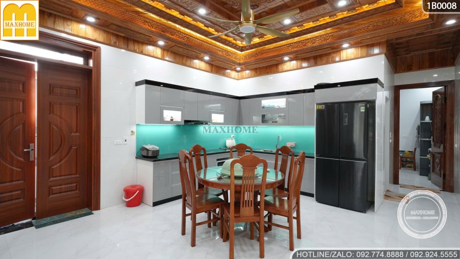 Đi sâu vào trong là phòng bếp hiện đại thiết kế mở liên thông với sảnh phụ. Hệ tủ bếp làm từ nhựa giả gỗ cao cấp, chịu nước tốt, chống ẩm mốc và đảm bảo độ bền lâu dài hơn gỗ tự nhiên. Tường bếp ốp kính cường lực xanh ngọc sáng phản chiếu ánh đèn nhẹ nhàng mang đến cảm giác sạch sẽ và thoáng rộng.