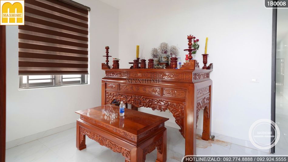 Tầng 2 bố trí phòng thờ, nơi không gian tâm linh quan trọng của gia đình chú Khải. Căn phòng được đặt ở vị trí hướng thẳng ra mặt tiền, hợp phong thủy và đón được ánh sáng dịu từ ban công nhỏ phía trước. Mọi đường nét bài trí đều thể hiện sự trang trọng và tôn kính tổ tiên mà đội ngũ thiết kế làm cho căn nhà này.