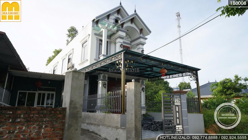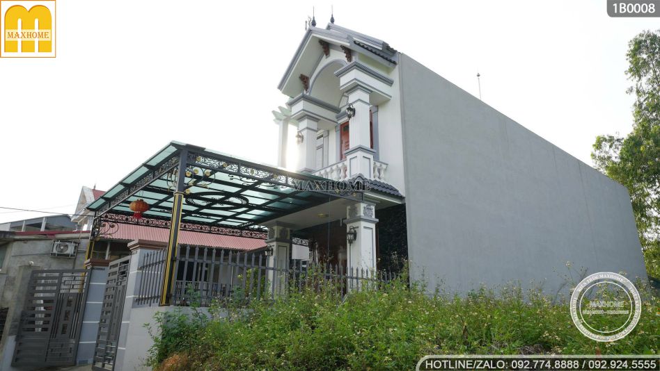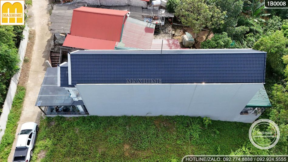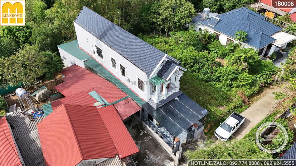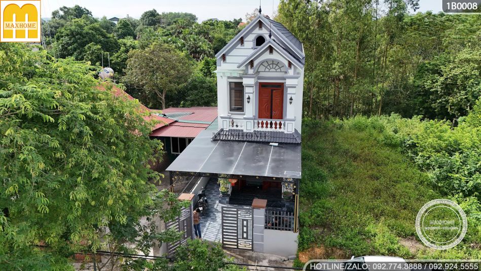 Từ góc nhìn trên cao có thể thấy rõ phần mái Thái được thiết kế gọn gàng, thu hồi vào trong thay vì đua ra ngoài để căn nhà lô phố vẫn thoát nước tốt mà không ảnh hưởng đến hàng xóm. Mẫu nhà đẹp này cũng nổi bật nhờ phong cách tân cổ điển nhẹ nhàng cùng hệ cột vuông lớn và các đường gờ phào chỉ được xử lý tinh tế.