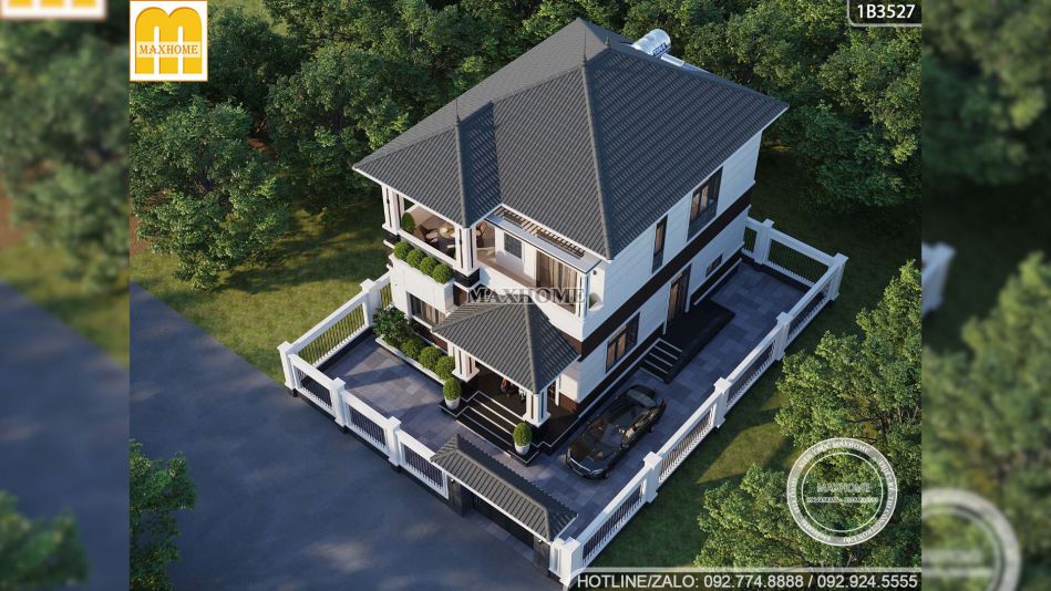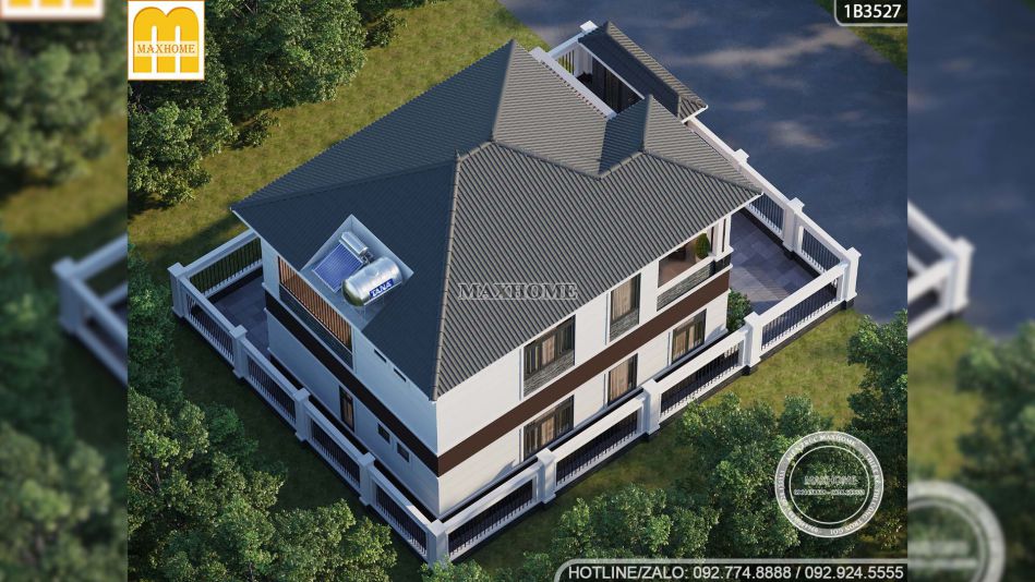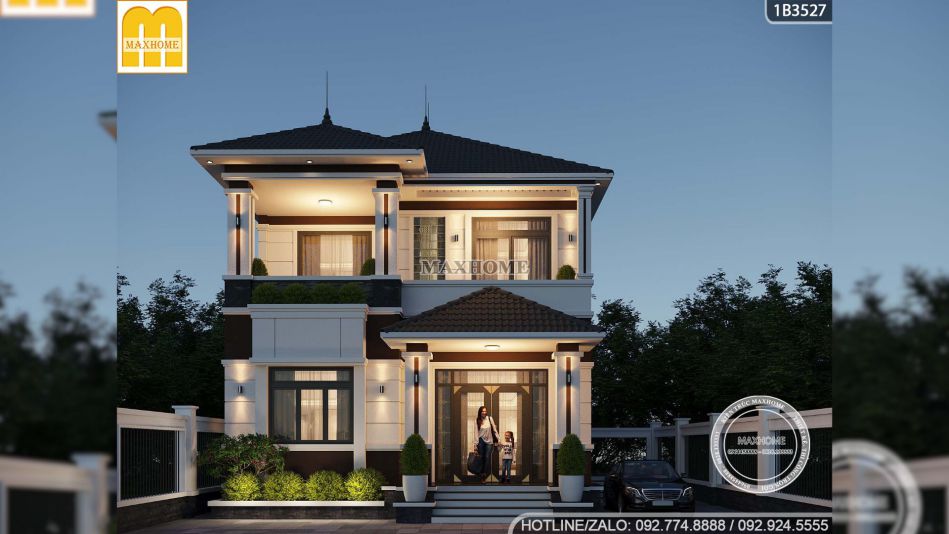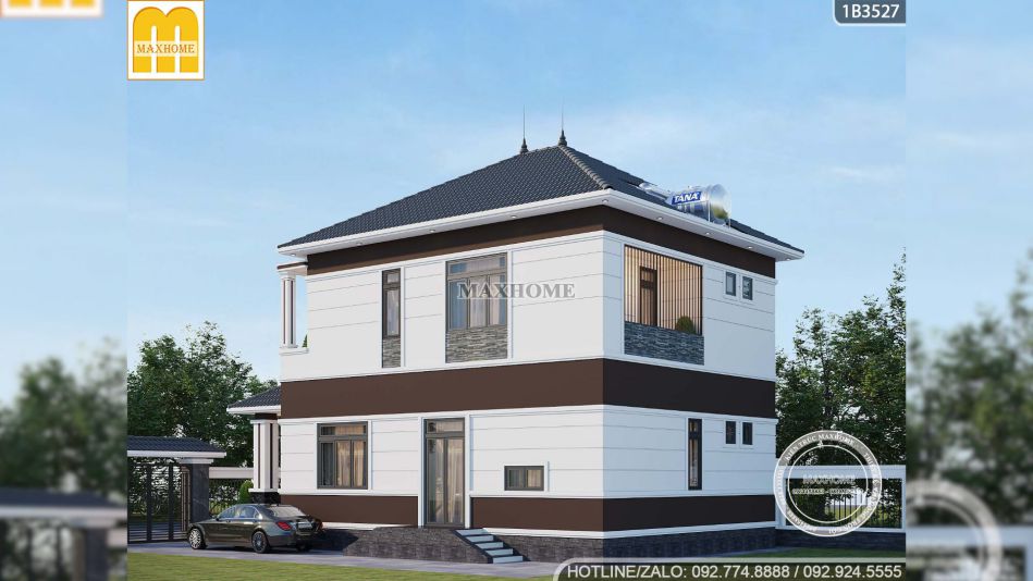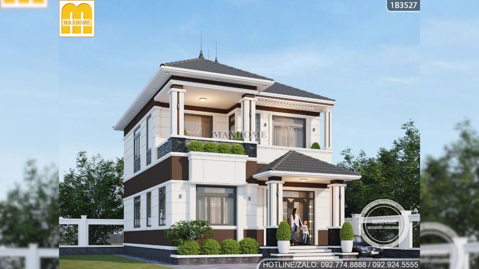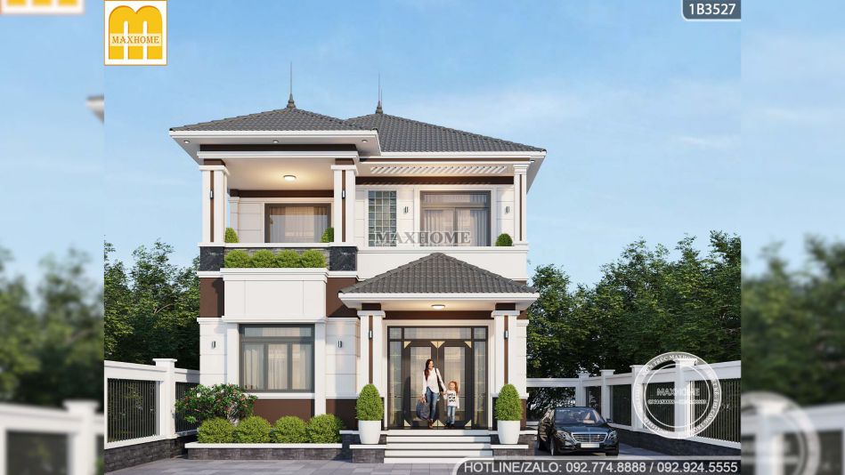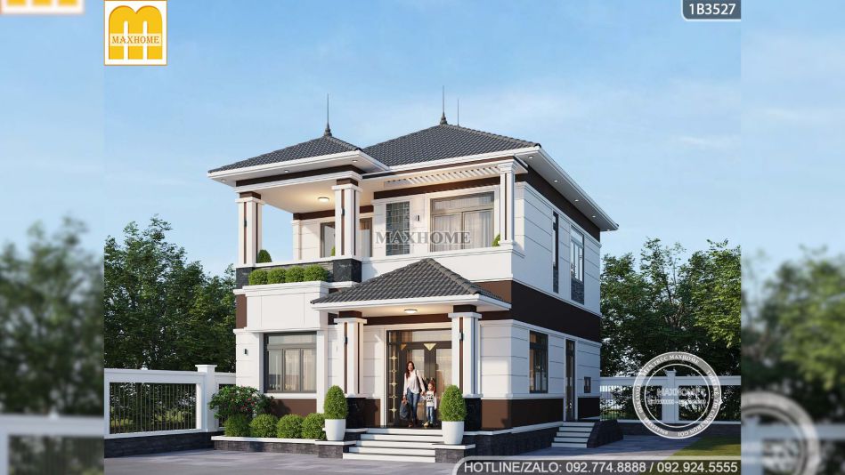 Maxhome lựa chọn tông màu trắng sứ làm chủ đạ, kết hợp hài hòa với màu sơn nâu cà phê tại các vị trí phân tầng và chân cột cho căn nhà 2 tầng 4 phòng ngủ. Sự tương phản này không chỉ giúp mẫu nhà đẹp trở nên nổi bật giữa không gian xung quanh mà còn tạo cảm giác sạch sẽ, sang trọng trường tồn với thời gian.