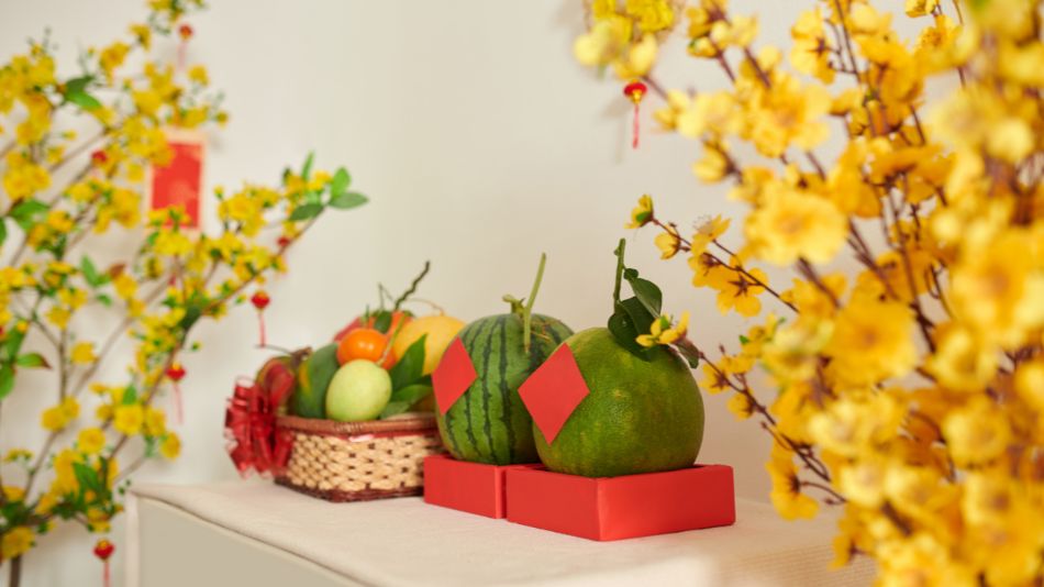 Bày mâm ngũ quả mini hoặc bát trái cây nhiều màu sắc, tượng trưng cho sự cân bằng ngũ hành Kim – Mộc – Thủy – Hỏa – Thổ.