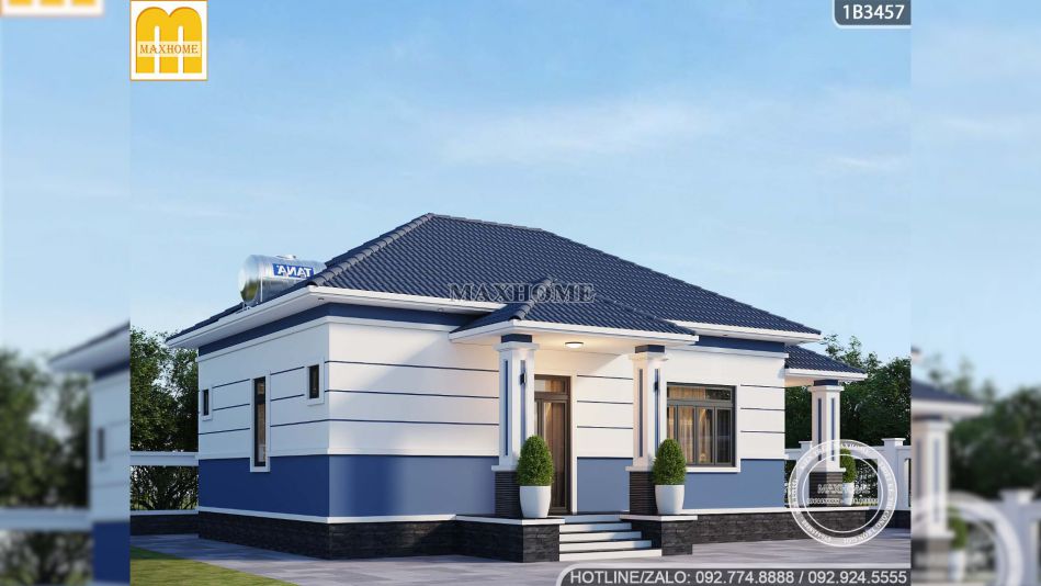 Màu sơn chủ đạo của căn nhà vườn này là màu trắng và xanh dương, sự đồng điệu giữa màu tường và màu mái giúp tổng thể hòa vào nhau nhẹ nhàng, không bị chói mà lại gợi cảm giác mát mẻ. Tường được soi chỉ với kích thước 30×15 chia đều cách nhau 480mm tạo nên hiệu ứng chiều sâu rất tự nhiên. Từng đường chỉ hiện lên rõ ràng nhưng không bị rườm rà đã góp phần định hình phong cách gọn gàng của mẫu nhà cấp 4 98m2 này.