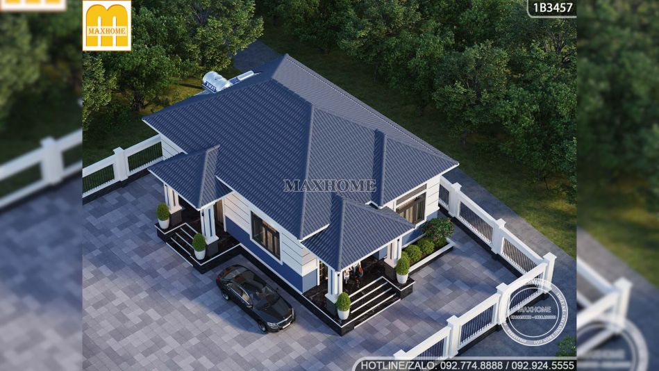 Hệ mái Nhật sử dụng mái ngói xanh dương đua ra đều ở cả hai bên, kiểu mái này không chỉ tôn dáng ngôi nhà mà còn giúp che chắn nắng mưa hiệu quả. Khi nhìn trực diện, tổng thể mái tạo thế cân đối và rất hài hòa với mảng tường màu trắng xanh phía dưới. Đây là kiểu mái rất hợp với khí hậu nông thôn miền Bắc vì sự bền chắc và đảm bảo tính thẩm mỹ lâu dài.