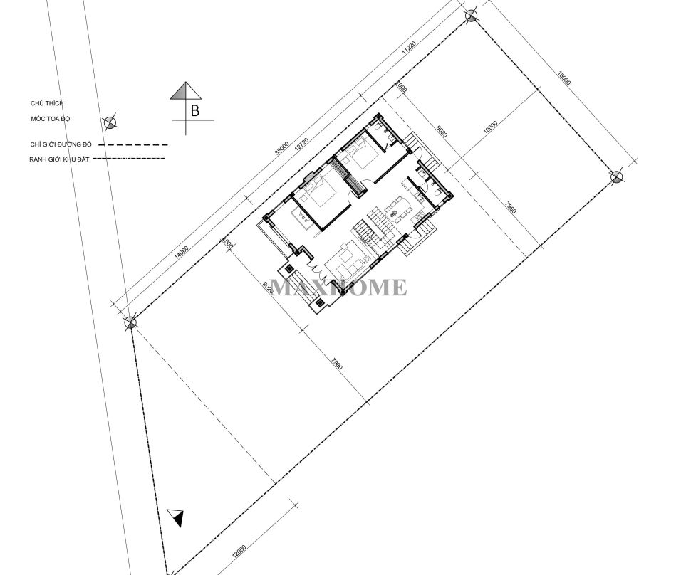 Dưới đây là hình ảnh mặt bằng định vị của mẫu nhà cấp 4 mái Nhật, cho thấy công trình được triển khai với kích thước xây dựng 9 x 14,8m. Với quy mô này, tổng diện tích sử dụng của ngôi nhà đạt khoảng 108m², đáp ứng tốt nhu cầu sinh hoạt cho gia đình ít thành viên. Bản vẽ định vị thể hiện rõ cách bố trí công trình trên khu đất, đảm bảo khoảng lùi hợp lý cho sân trước và lối đi xung quanh. Nhờ sự tính toán kỹ lưỡng về tỷ lệ xây dựng, ngôi nhà không chỉ cân đối về mặt kiến trúc mà còn đảm bảo sự thông thoáng, thuận tiện trong quá trình sử dụng lâu dài.