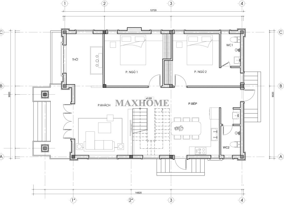 Phía sau là phòng bếp và khu vực ăn uống được bố trí liền kề, đảm bảo sự ấm cúng và thuận tiện trong quá trình sử dụng. Nhà vệ sinh chung đặt cạnh bên ở vị trí hợp lý, dễ tiếp cận nhưng vẫn đảm bảo sự kín đáo. Khu vực thờ cúng được bố trí ở phía trước nhà, tại vị trí trang trọng và yên tĩnh, thể hiện sự tôn nghiêm theo truyền thống của người Việt. Hai phòng ngủ được sắp xếp cạnh nhau nhằm tối ưu diện tích, trong đó phòng ngủ 02 được thiết kế thêm nhà vệ sinh khép kín bên trong, mang lại sự riêng tư và tiện nghi cho người sử dụng. Tổng thể mặt bằng được tính toán khoa học, đảm bảo sự hài hòa giữa công năng và yếu tố phong thủy.