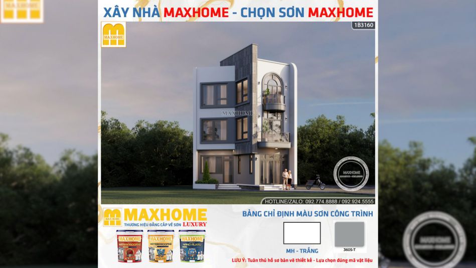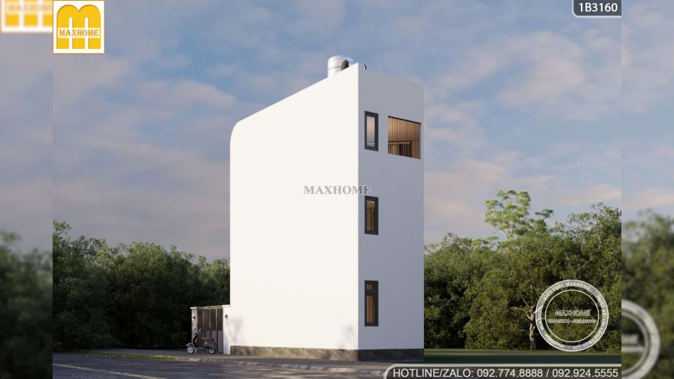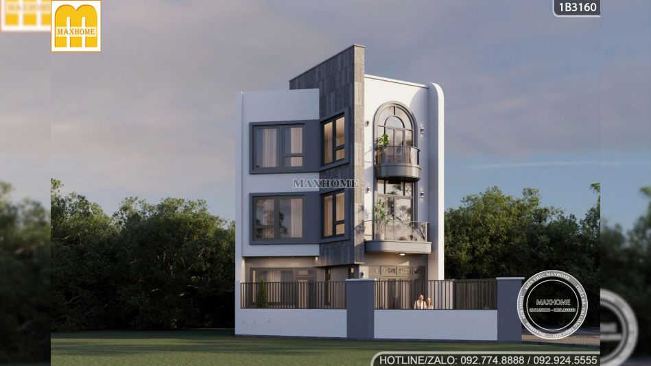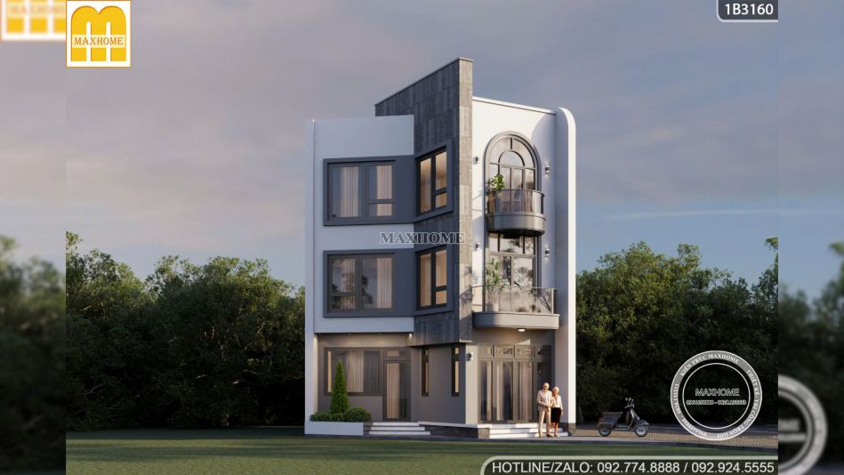 Một yếu tố đáng chú ý khác trong thiết kế ngoại thất của công trình nhà chị Mỹ chính là cách Maxhome xử lý phần khối đứng và khối ngang. Ở mẫu nhà phố 3 tầng trên đất méo, đội ngũ thiết kế Maxhome đã tinh tế sắp xếp các mảng tường và cửa sổ so le tạo hiệu ứng thị giác mạnh mẽ để giúp mặt tiền trông sâu và có chiều cao hơn. Dù diện tích đất không lớn với 160m2 cho 3 mặt sàn, ngôi nhà vẫn mang đến cảm giác thoáng đãng và hiện đại nhờ tỷ lệ khối kiến trúc cân đối và hợp lý. Từng tầng đều được nhấn nhá bằng các chi tiết vừa đủ, tránh rườm rà nhưng vẫn thể hiện rõ phong cách riêng của gia chủ.