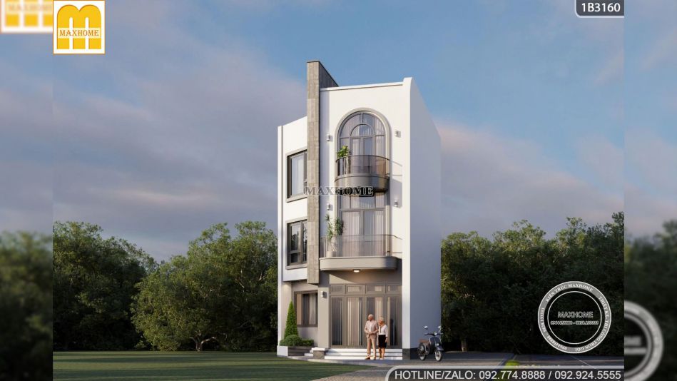 Từng chi tiết như lan can kính hay cửa vòm trang trí đều được thiết kế tỉ mỉ để đảm bảo tính thẩm mỹ và góp phần che nắng, giảm bức xạ nhiệt cho ngôi nhà. Ngoài ra, màu sơn trắng chủ đạo kết hợp cùng những mảng tường ốp gạch xám trung tính giúp tổng thể ngôi nhà phố 3 tầng toát lên vẻ hiện đại, sạch sẽ và sang trọng. Cách phối màu khéo léo này giúp nổi bật các chi tiết kiến trúc và còn khiến công trình hòa hợp với không gian xung quanh một cách tự nhiên.