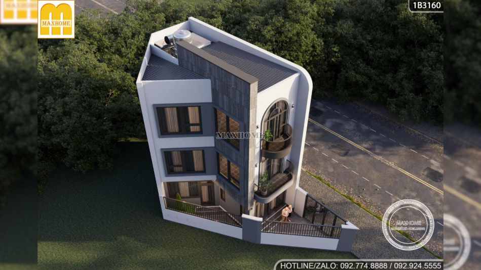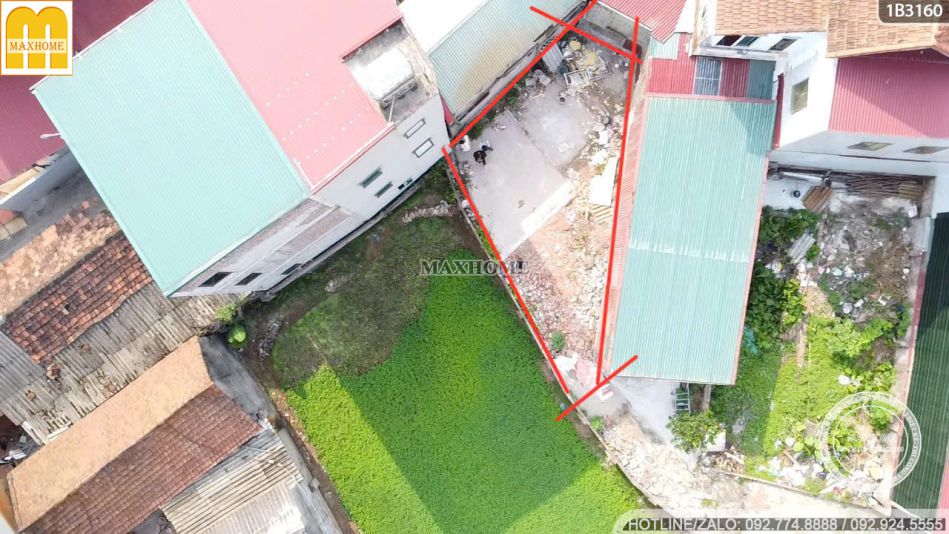 Hình ảnh mặt bằng định vị được chụp từ flycam cho thấy rõ hình dáng khu đất đặc biệt với một tam giác lệch với nhiều góc khác. Đây chính là yếu tố khiến thiết kế mẫu nhà phố 3 tầng trên đất méo của Maxhome trở nên ấn tượng và khác biệt. Đội ngũ thiết kế đã tận dụng tối đa diện tích đất méo đồng thời xử lý khéo léo các góc chéo bằng đường bo cong mềm mại giúp không gian tổng thể vừa gọn gàng vừa đạt hiệu quả thẩm mỹ cao. Dù mảnh đất có hình dạng bất lợi nhưng ngôi nhà vẫn được bố trí hợp lý để có lối ra vào thuận tiện và khoảng sân nhỏ phía trước giúp tạo nên cảm giác thông thoáng ngay từ tầng 1.